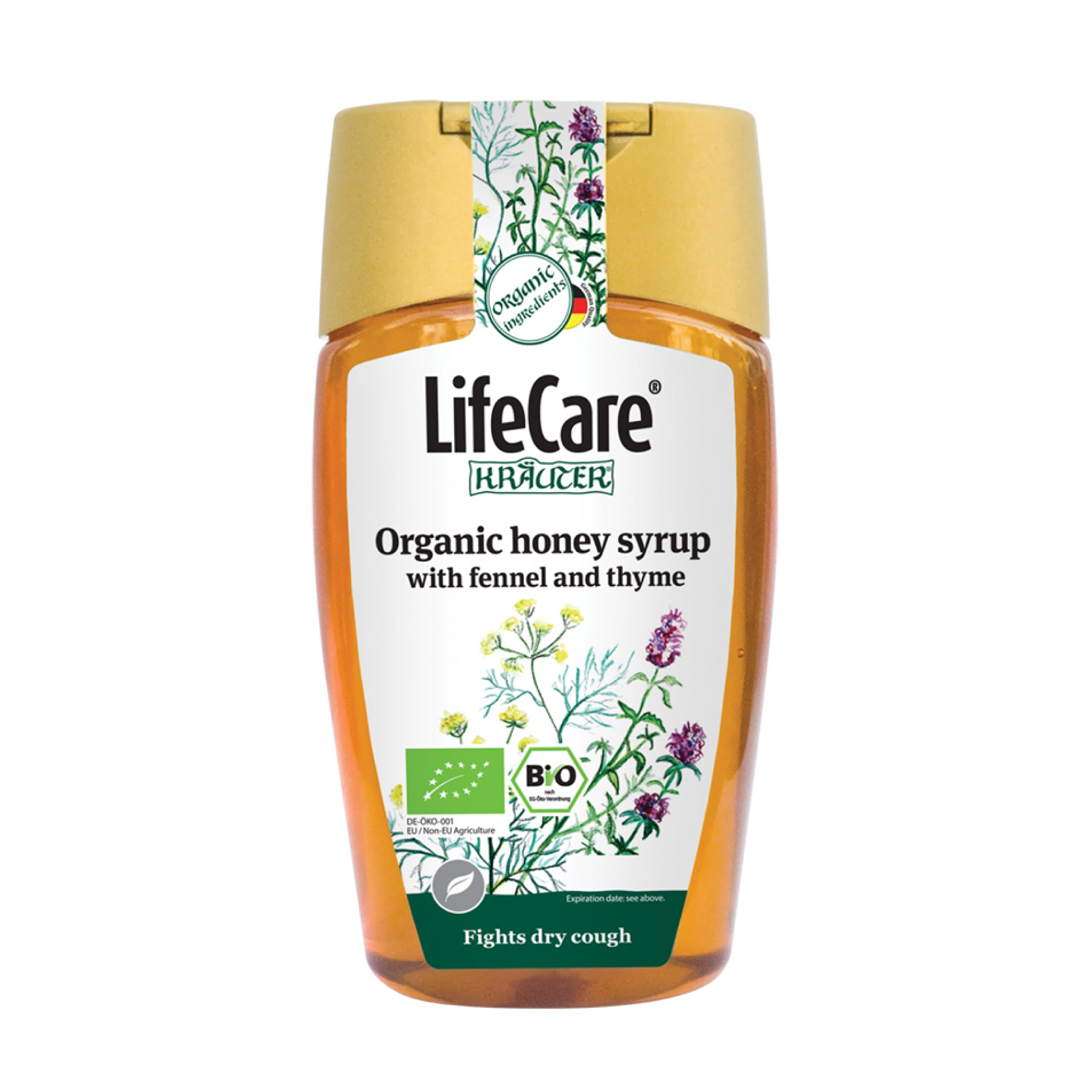 Köhögés elleni szirup. Gyógyászati termék a torok és a légutak számára. A szirup, a zamatos méz, az édeskömény és a kakukkfűolaj keveréke, kiváló és természetes nyugtató a légúti megbetegedések által okozott köhögésre és irritációra. Az édeskömény és a kakukkfű számos módon van kedvező hatással a torokra és a légutakra. Nem tartalmaz mesterséges színezéket, mesterséges aromákat, édesítőszereket és adalékanyagokat. Vegetáriánus termék.