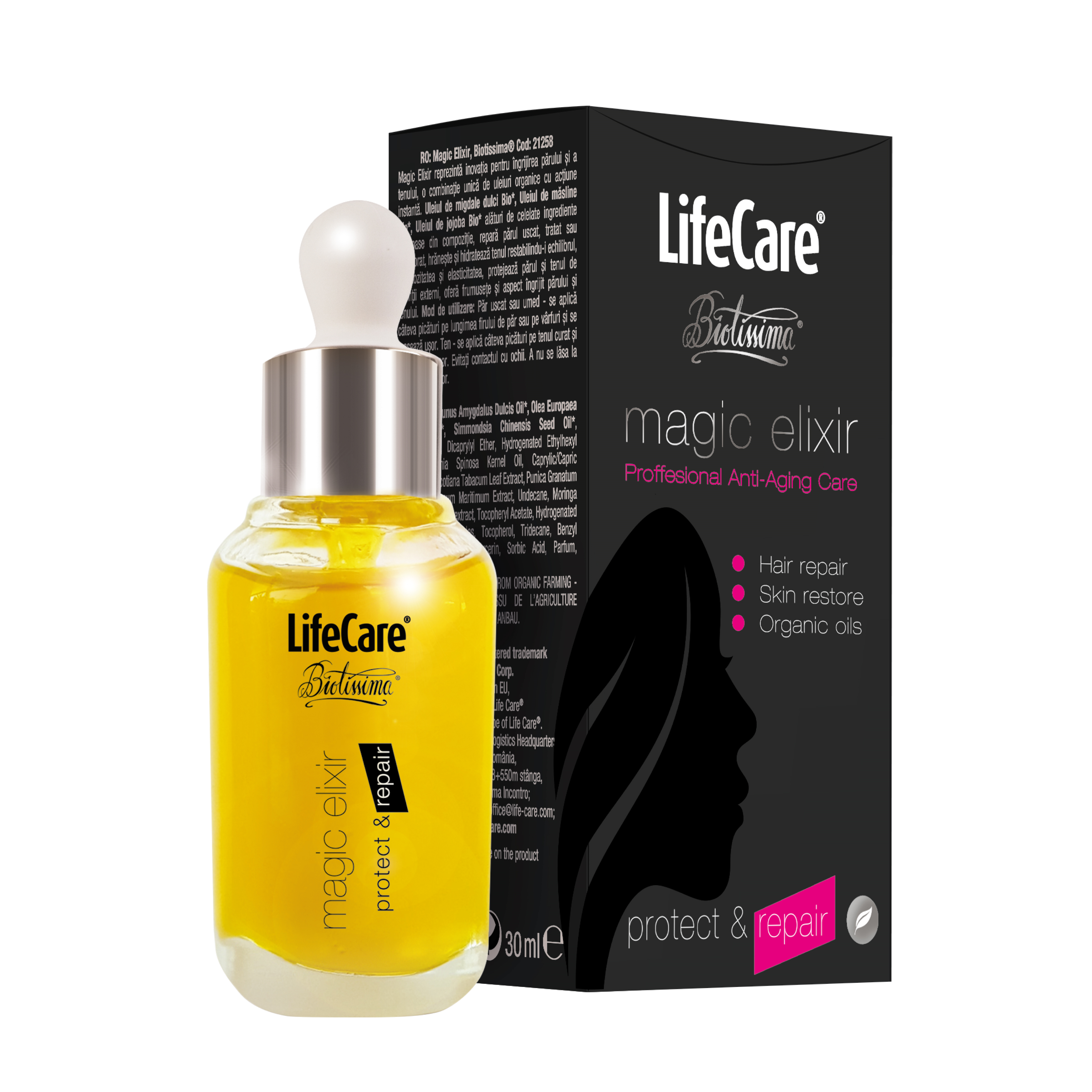 A Haj- és Bőrolaj, Magic Elixir, BIO növényekkel, Life Care® a haj és a bőrápolás innovációja, az organikus olajok egyedülálló kombinációja, azonnali hatással.